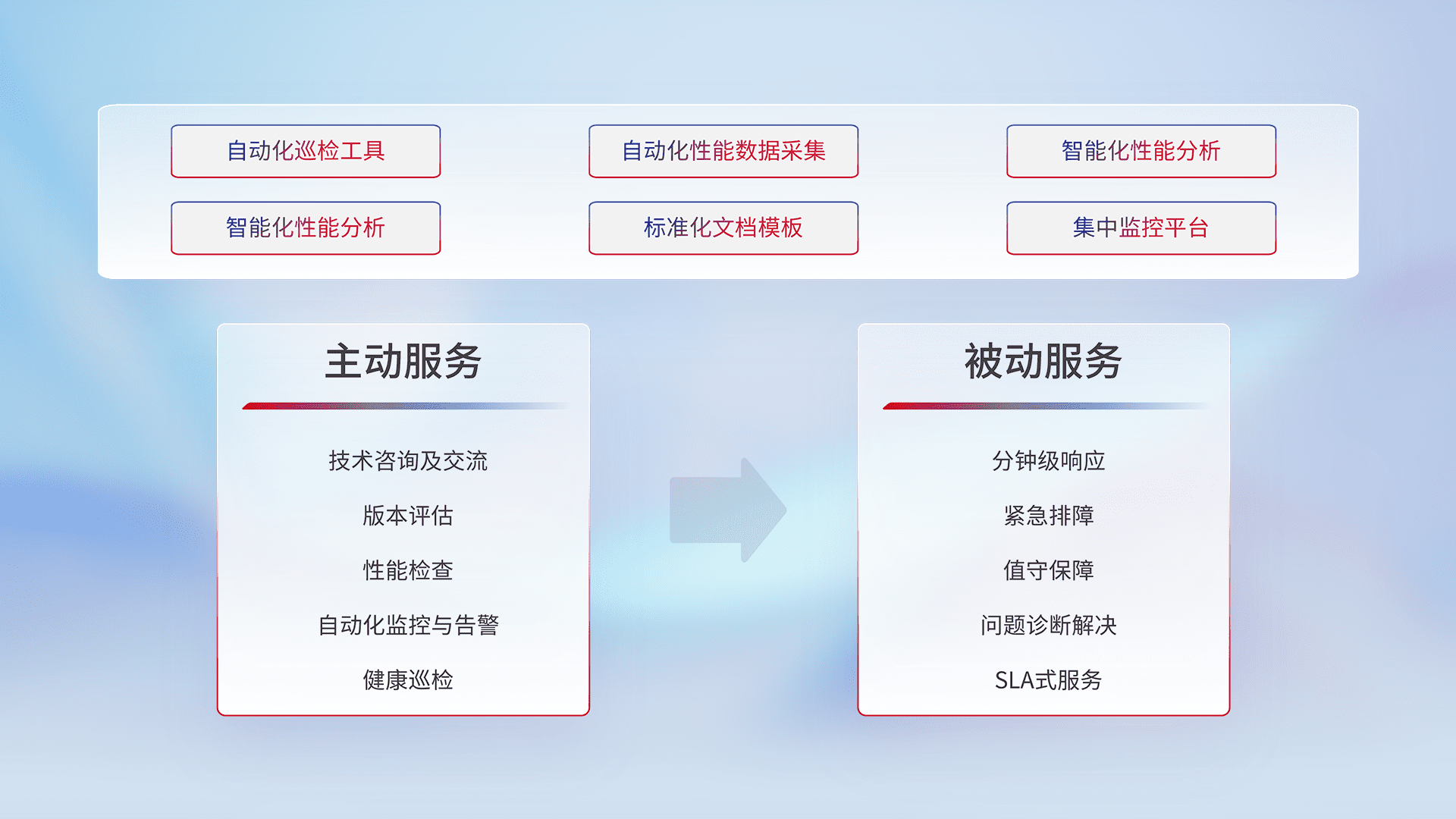 智能化工具和标准化文档,,保障服务质量,,,提供主动服务(包含技术咨询、、版本评估、、性能检查、、、自动化监控与告警、、、健康巡检)和被动服务包含(分钟级响应、、、、紧急排障、、、、值守保障、、问题诊断解决、、、SLA服务)。。